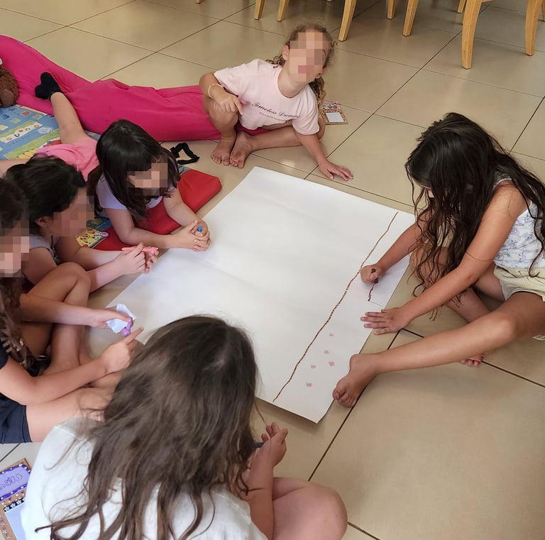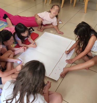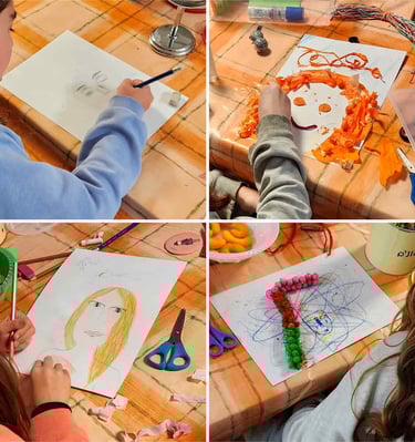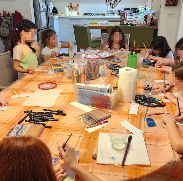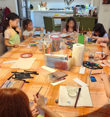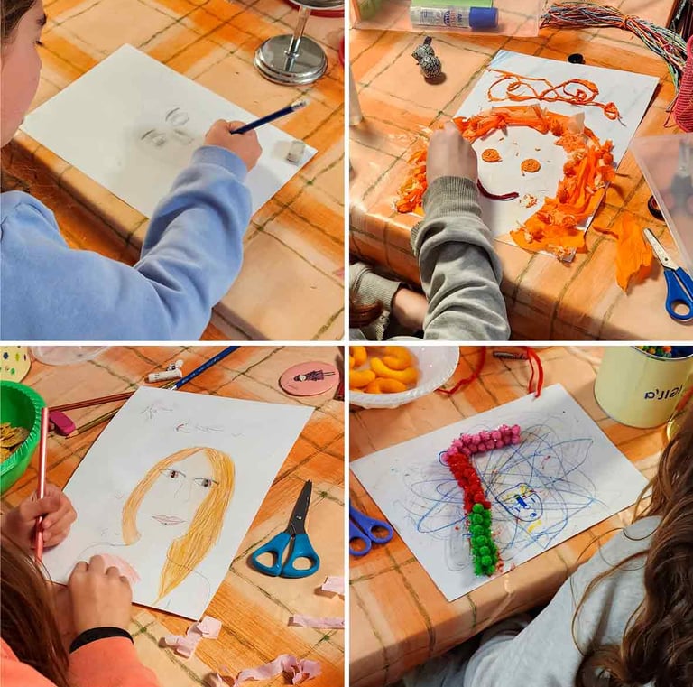 In my art workshops for children, I integrate guided imagination, mindful breathing, play, and guided conversation to complement the free and non-judgmental creative process. These elements help children strengthen their self-esteem, discover their potential, and release limiting beliefs in a natural and enjoyable way.